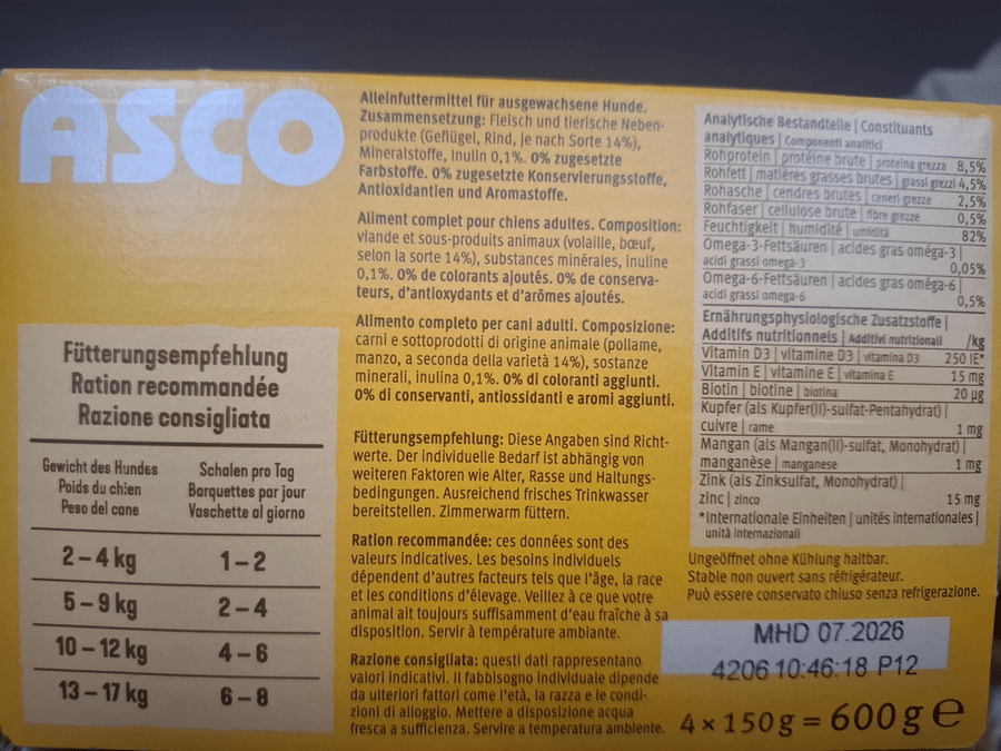 Unser Hund mit 5kg Körpergewicht hat eine sehr empfindliche Verdauung (Allergiker). Könnten Sie uns daher bitte die genauen Zutaten der Asco Rind- sowie der Geflügel-Terrinen (pro Sorte separat) à 150g mitteilen? Die Angaben auf der Verpackung sind zu ungenau für einen Allergiker. Ideal wäre es, wenn man die beiden Sorten einzeln kaufen könnte, falls er eine nicht verträgt.