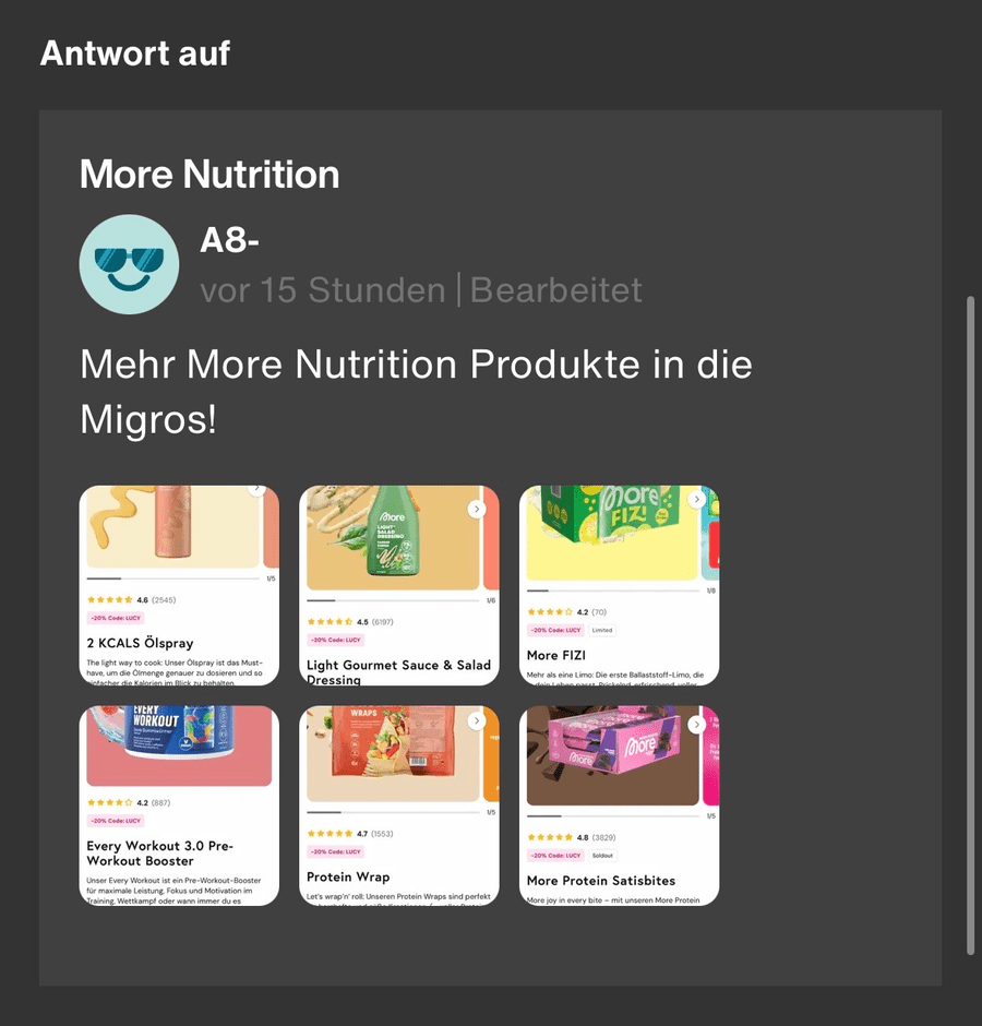Diese Leier mit „mehr xy-Produkte“ hatten wir doch kürzlich schon… Damals wurden aus den More-Produkten ganz schnell vegetarische Modeprodukte, als sich die Diskussion um den zweifelhaften Ruf von More zu drehen begann.Mehr zur Kritik:https://www.foodwatch.org/de/informieren/taeuschung-irrefuehrung/gesundheitsschwindel/kritik-an-chunky-flavour-und-co-von-more-nutritionhttps://m.youtube.com/watch?v=9kYPqQOQxHw&t=533s&pp=2AGVBJACAQ%3D%3DAuch hier ist der Startbeitrag editiert worden (zur Sicherheit hänge ich mal einen Screenshot an). Was soll die Masche?