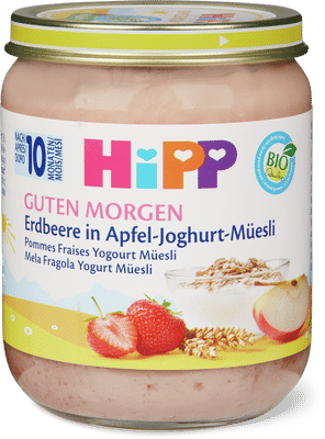 DasHiPP Guten Morgen Erdbeere-Joghurt-Müesli im Glas ist eine ideale Mischung aus auserlesenen, milden Früchten, feinkörnigem Vollwertgetreide und cremigem Joghurt – ganz ohne Zuckerzusatz, in bewährter HiPP Bio-Qualität.