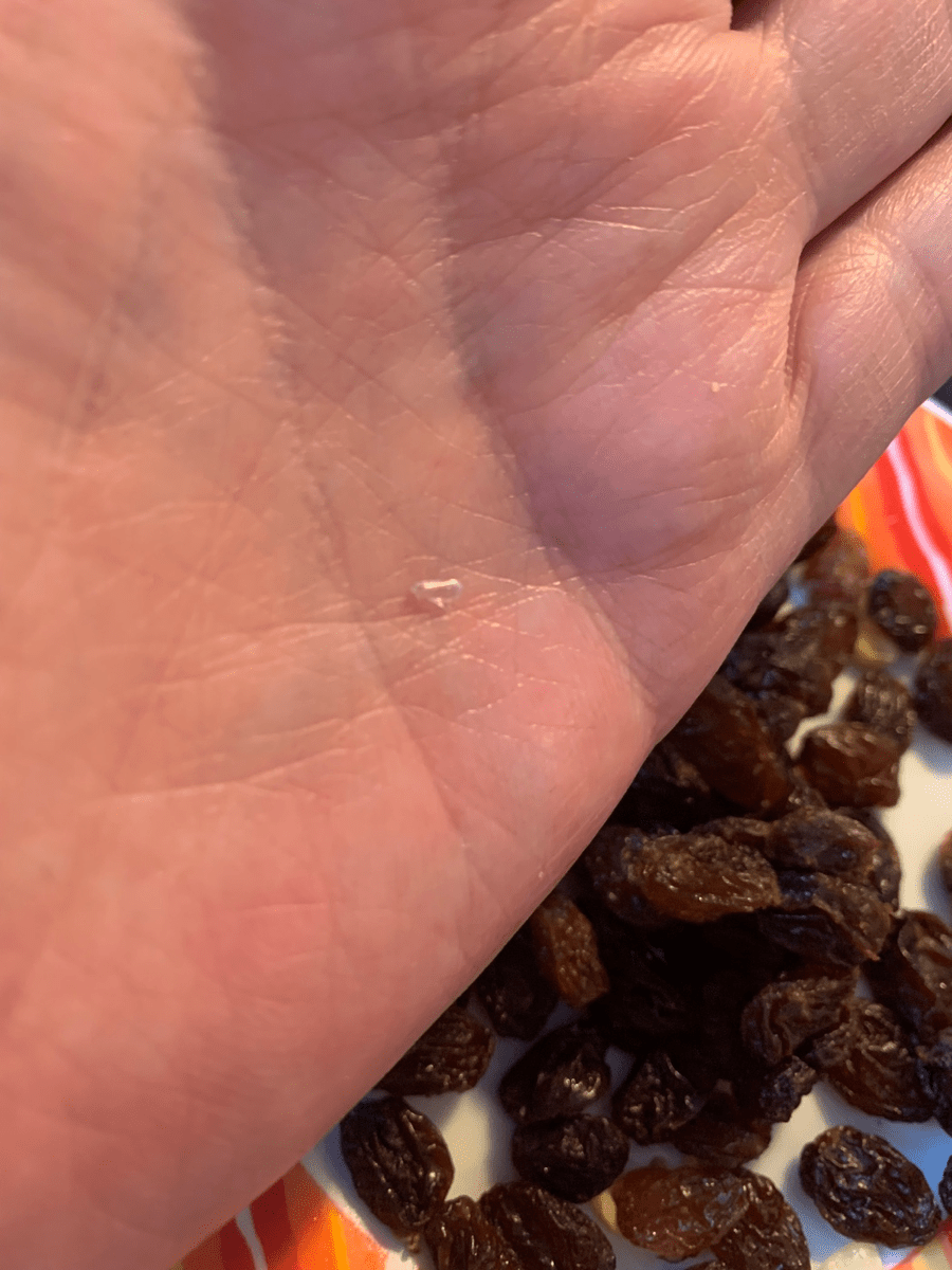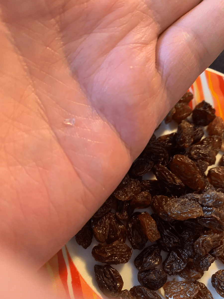 Achtung! Ich esse regelmässig M-Budget Sultaninen. Heute biss ich auf etwas hartes und habe die Sultaninen wieder ausgespuckt. Da ist dann diese Glasscherbe zum Vorschein gekommen! Ich hatte hier weder kaputte Gläser noch habe ich sonst was zerbrochen. Glasscherben sind höchst gefährlich und können schwere innere Verletzungen verursachen.