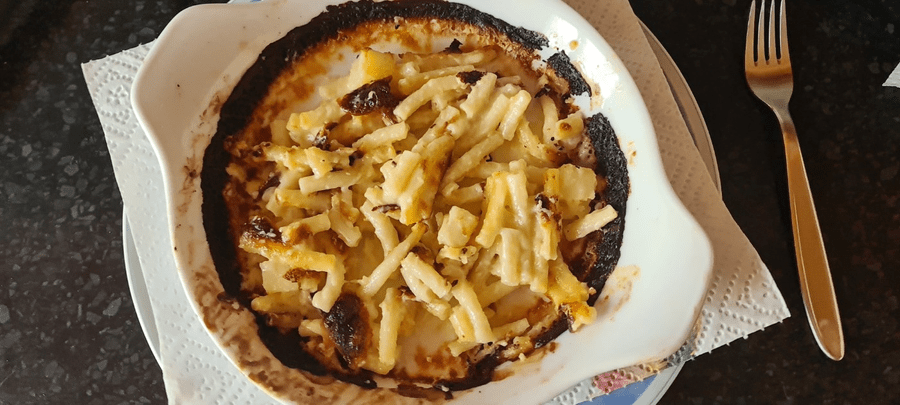 At first, I thought it was my fault, that I might have overlooked something, because it seemed strange to me not to add any cream, but I thought, OK, they know what they're doing. I then read it another seven times and couldn't find anything that said you should add water, milk, or cream. Some of these ingredients would certainly have been needed to prevent it from burning, but if you don't know that, you just rely on the preparation instructions, and as I found out, they are incorrect. Well, it couldn't be any other way, otherwise it wouldn't have burned. When a product is new, I always use a little less heat to be on the safe side, as every oven is different, and normally it should have been in the oven for at least 40 minutes according to the instructions. After 33 minutes, I checked because it started to smell strange in the kitchen and saw that it was burning, so I took it out immediately. If I had left it in the oven for the full 40 minutes as specified, I would have had to throw away the baking pan, which makes it even less sensible to leave it in the oven for 45 minutes because then it might have started to burn, and nobody wants that, right? I've known this product for several years, and with the old version, you had to add 0.5 dl of cream after 3/4 of the time, but that's not the case with the new version. I can't say what went wrong, but I don't like it because I loved this product when it was in the tray, and now I have to buy one somewhere else and try it, or make my own, but unfortunately, I won't be buying this one anymore.