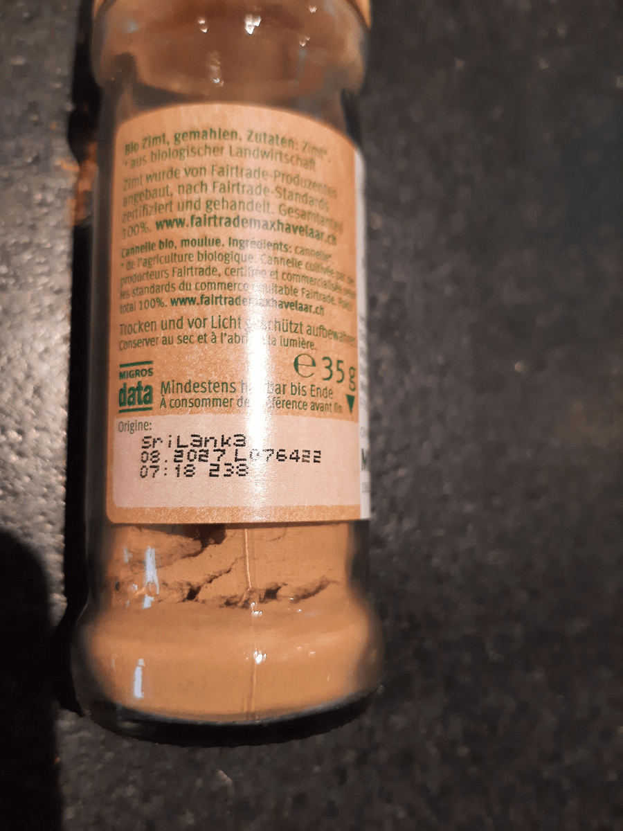 I also recently bought the spoiled cinnamon: Marked Origine Sri Lanka 08:2027 L076422 06:15 240. The taste is disgusting, and it took me a while (and two dishes to throw away) to realize what was rotten. Dead animal (see Windar) hits the nail on the head. Question: If Migros has known for several weeks that there is a spoiled product on its shelves: Why is nothing done and this cinnamon recalled and customers warned against buying it with a clearly visible notice in the stores? What I find sad is that others who have complained, as can be seen below, are told that their own samples have no off-flavor. Strange really, of all things... And: what else might this garlic cinnamon have been contaminated with?