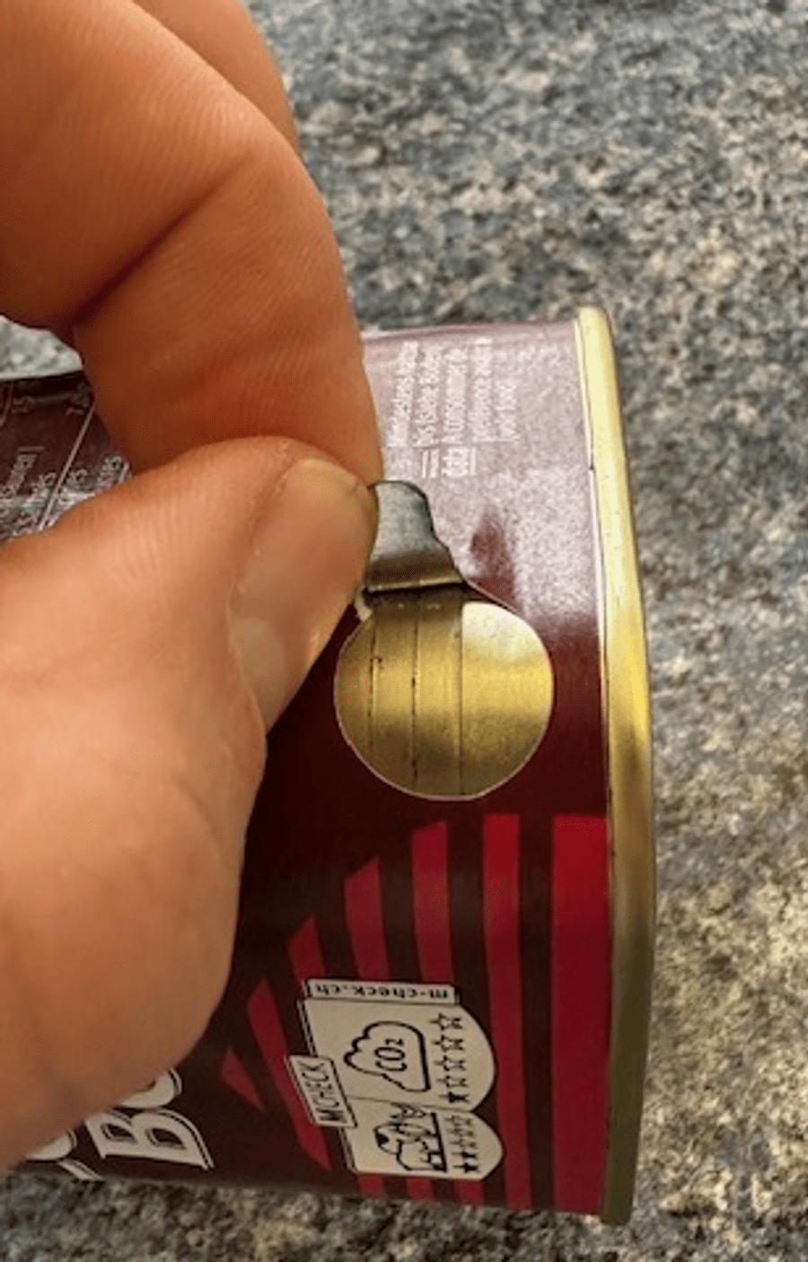 2. Push up the metal tab on the side of the can slightly (see photos 2 to 3).