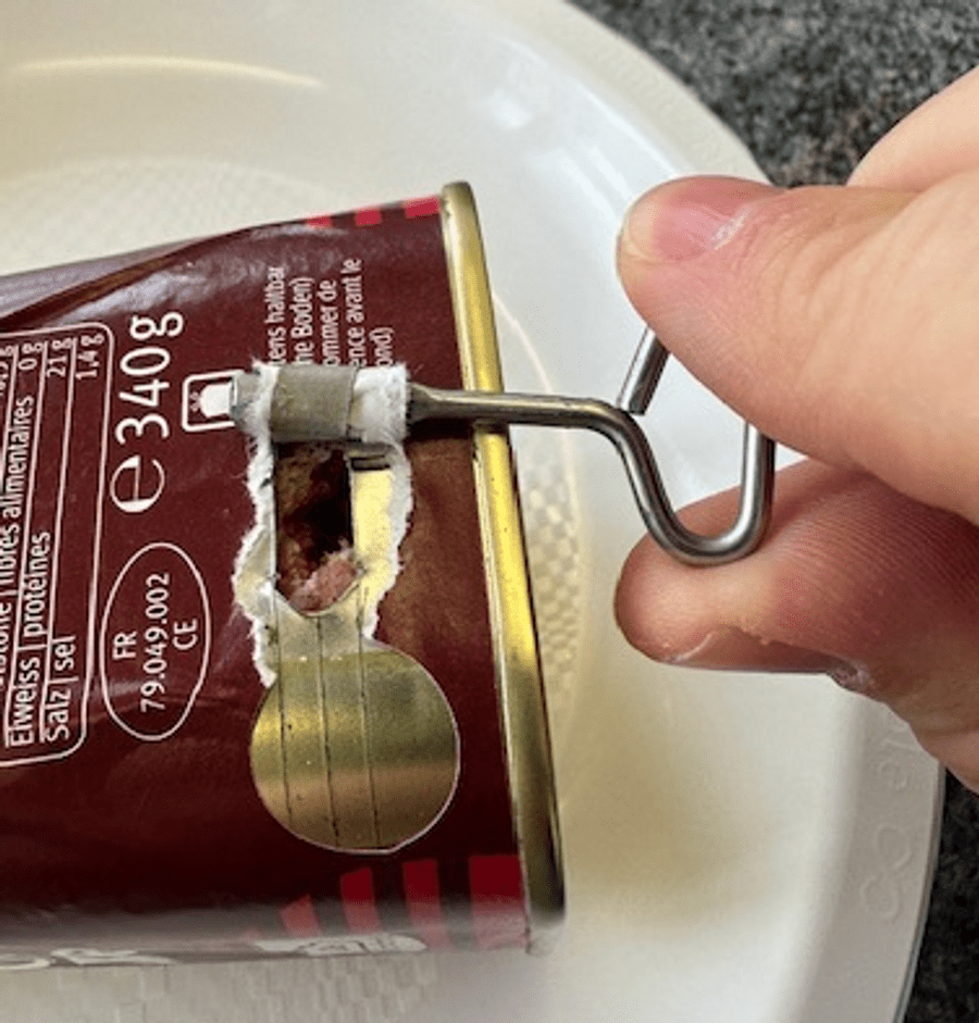 4. Turn the tool forwards so that the metal tab is wound up and the can opens (see photo 5).