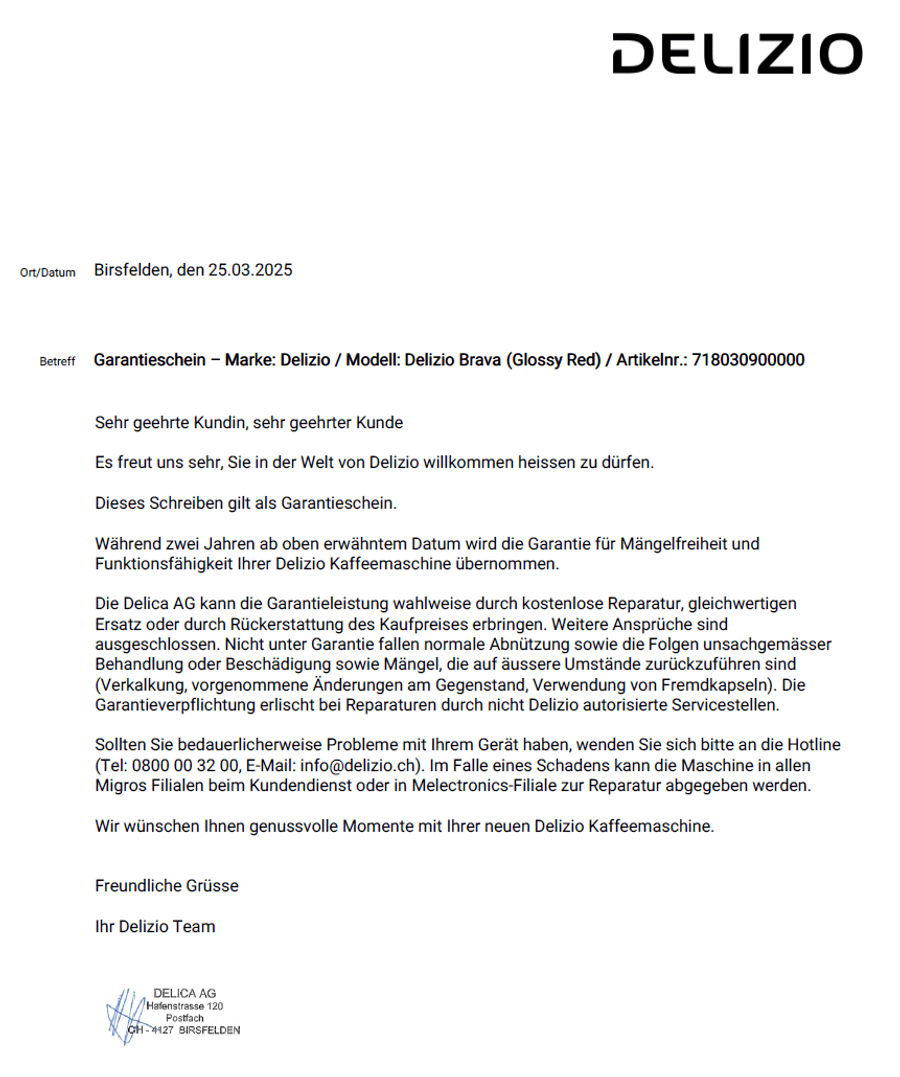 Today, January 19, 2026, at 2:10 p.m., we attempted to return the Delizio coffee machine for repair under warranty at the Migros branch in Lyss, handing it over to Migros employee S. at reception. Although we were able to present a dated Delizio warranty certificate, which explicitly states that the machine can be returned to Migros stores, the return was refused. Our request to speak to the customer service manager was also rejected.
