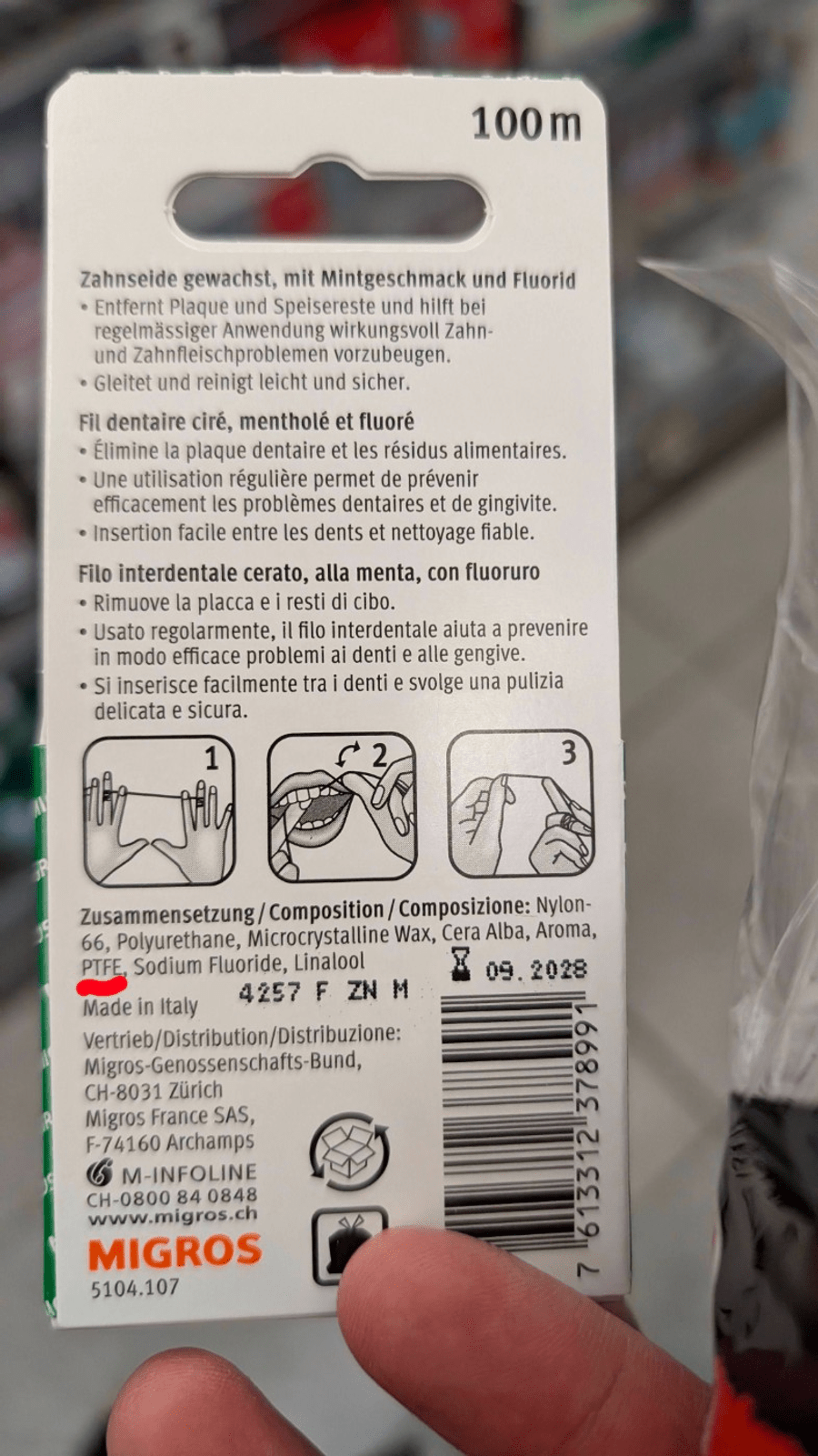 I've been looking at the compositions for a while now and they've never changed. Today, 20.05.2025 in Biel, I took a photo of an m-budget dental floss pack. The composition still says PTFE (see photo).