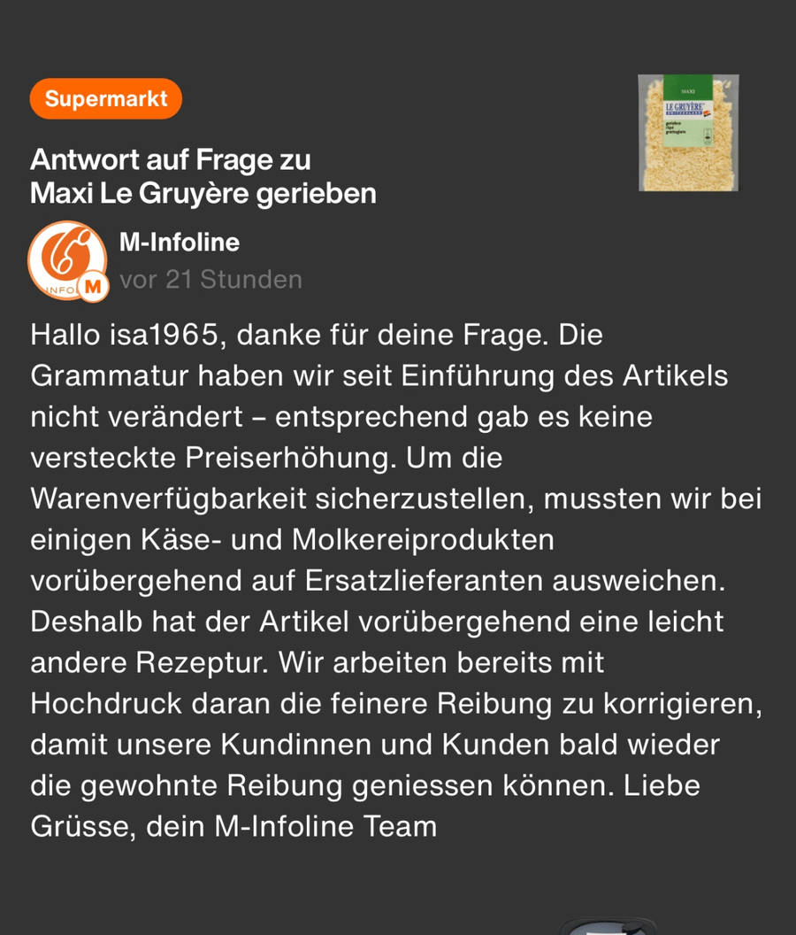 Hello Mario14, thank you for your inquiry. In order to ensure the availability of goods, we had to temporarily switch to substitute suppliers for some cheese and dairy products. This step was necessary in order to be able to offer a reliable range even in challenging times. Best regards, your M-Infoline team
