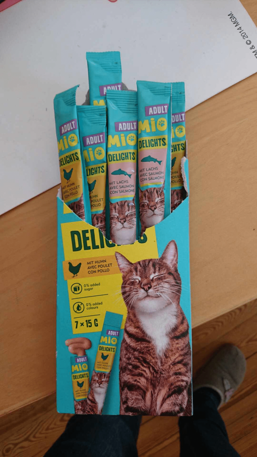 Dear ladies and gentlemen from Migros, I have already opened 3 packs of "Mio Delights/Snacks with chicken" (adult/for cats) and the salmon variant was always included, 2 to 4 pieces (out of 7).