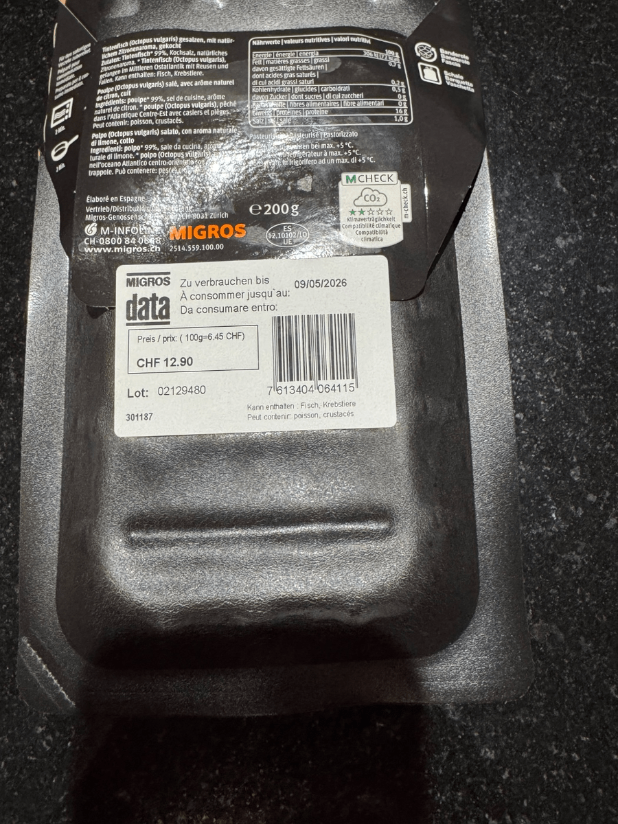Hello FRED-Swiss, thank you for sending us the photo. After consultation with our specialist department, we can confirm that the shelf life of the octopus arms is at least 30 days. In most cases, the products have a significantly longer best-before date. In some cases, the goods go through intermediate storage and are not delivered directly, which means that the shelf life varies. In your case, we can confirm that the best-before date 09 May 2026 for the batch 02129480 is correct. Hopefully we were able to help you with our answer! Best regards, your M-Infoline team