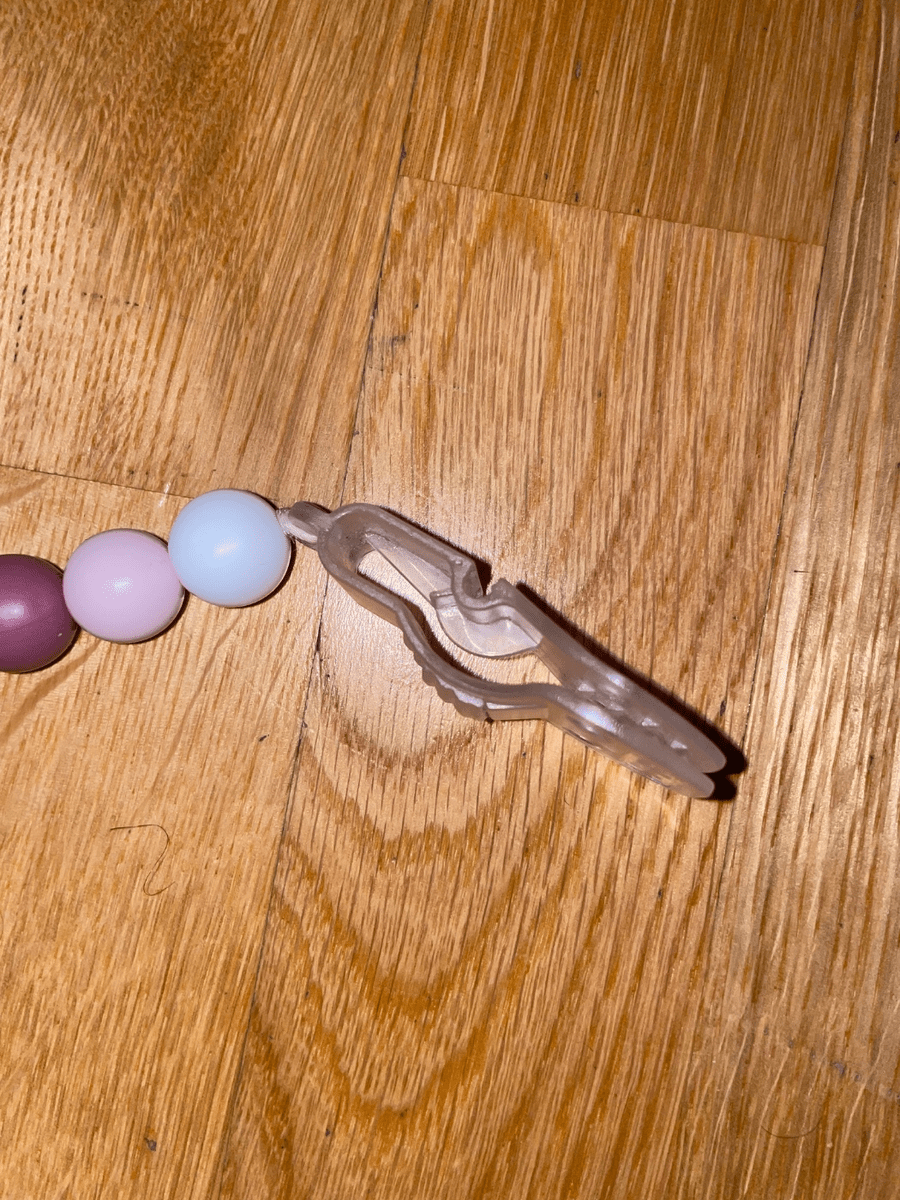 Je suis profondément déçue par la qualité de cette attache-sucette. Après une utilisation très courte (achetée au printemps 2025 environ), l'anse en plastique s'est tout simplement cassée au niveau de l'attache. Mon bébé de 11 mois tenait déjà le morceau détaché et coupant dans sa main et voulait le mettre dans sa bouche. J'ai pu éviter au dernier moment qu'il ne soit avalé ou blessé.