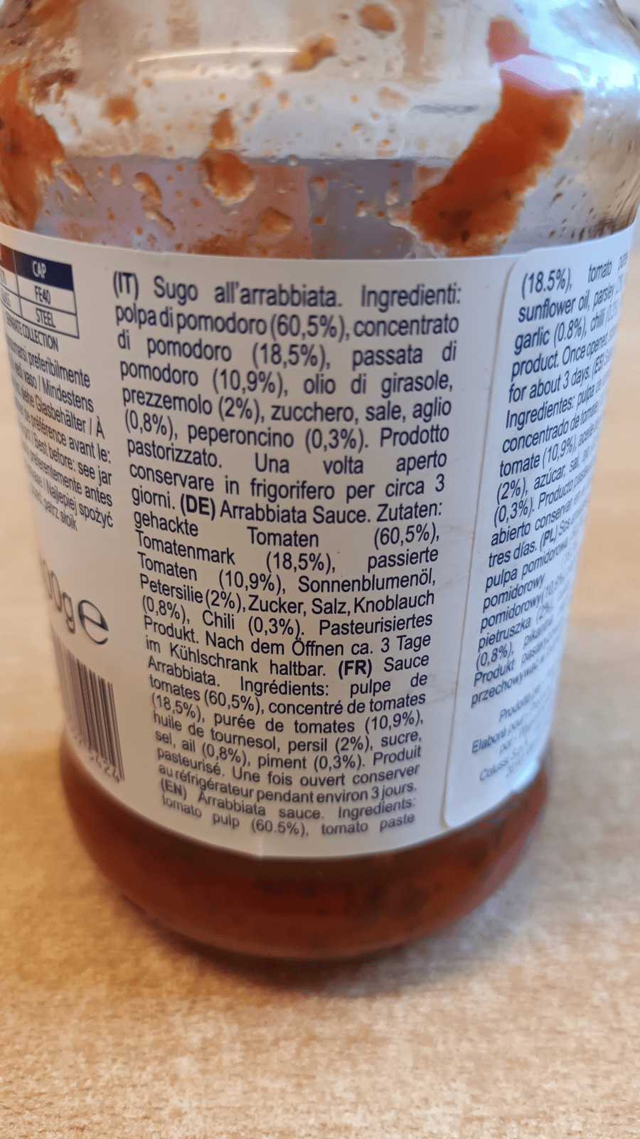 Ciao Jeany5000, grazie per la tua richiesta di informazioni sulla nostra Arrabbiata Agnesi. Si tratta effettivamente di una nuova ricetta. Al posto del sale, utilizziamo le acciughe come sostituto della pasta di condimento. Questo è soggetto a dichiarazione, ed è per questo che troverete questa informazione sull'etichetta. Cordiali saluti, il vostro team M-Infoline