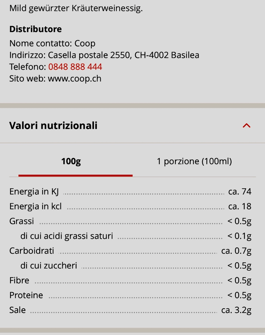 Ciao Jeanne77, grazie mille per il tuo messaggio e per le foto. Con piacere abbiamo confrontato i due prodotti. Il contenuto energetico è identico. Sia Migros che Coop dichiarano 18 kcal per 100 ml. Il contenuto di kJ varia minimamente, con il nostro (77 kJ) che corrisponde al contenuto della bottiglia di aceto Chirat. Cordiali saluti, Tabea