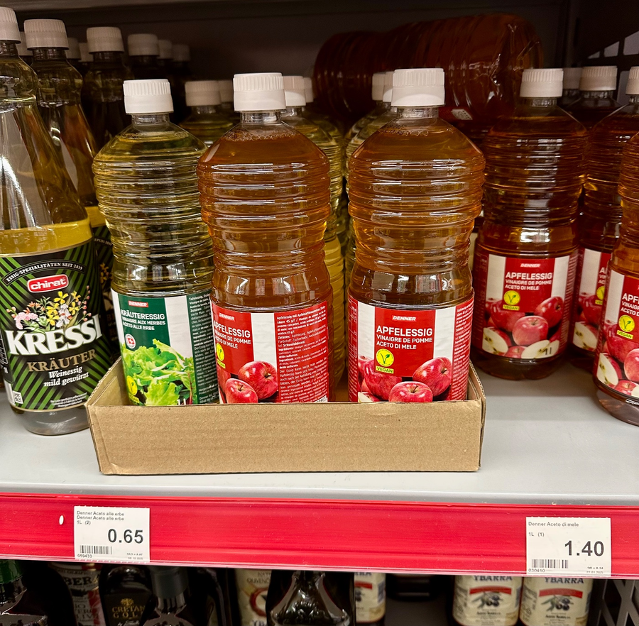 Alla Denner: aceto alle erbe di mamma Helvetia per la modica cifra di Fr. 0.65 e aceto di mele, anche questo firmato dalla cara mamma Helvetia, a Fr. 1.40.
