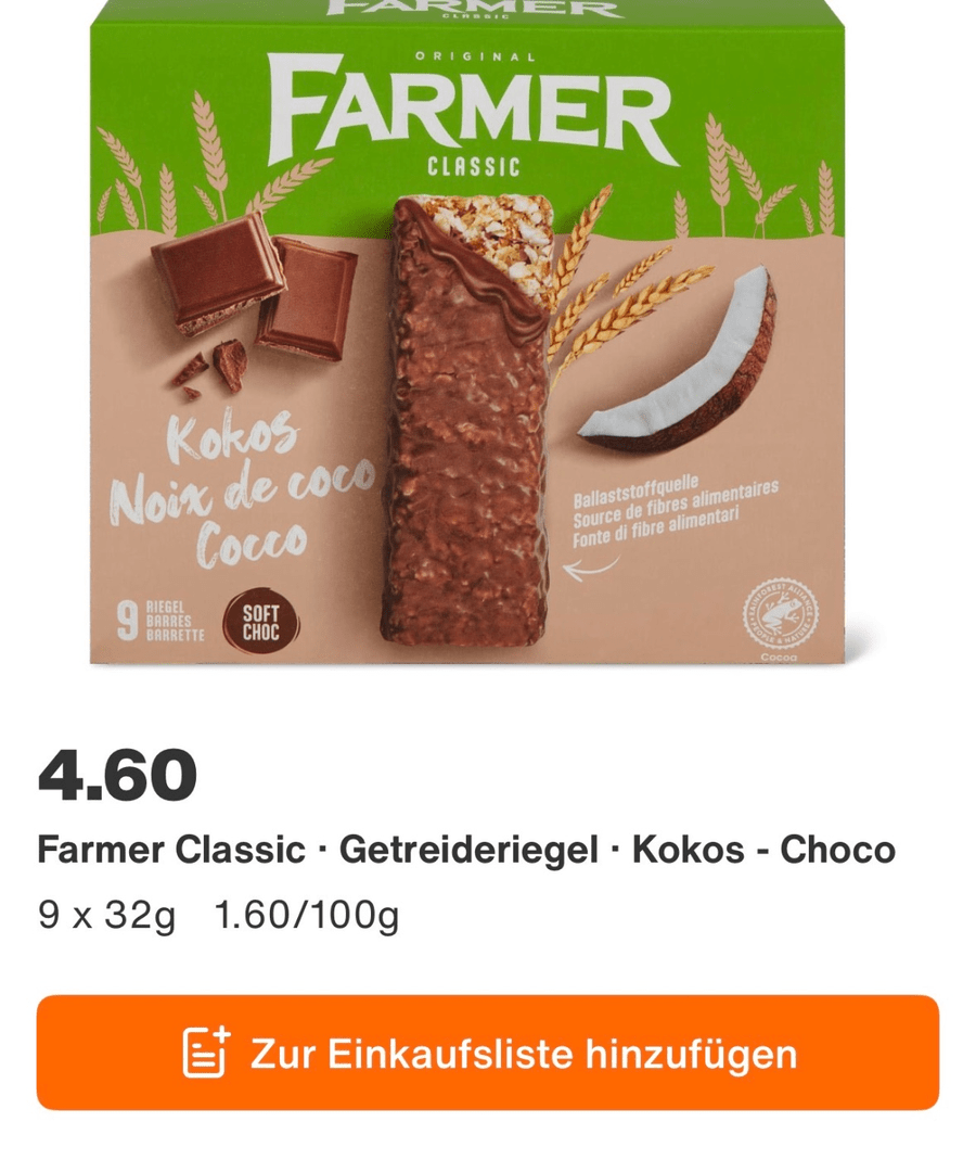Che peccato, che peccato. Molti anni fa ci piaceva avere a casa quasi tutte le barrette Farmer. Ma purtroppo la ricetta è stata cambiata così tanto che le barrette non sono più molto gradevoli. Sembra che tutti gli ingredienti di qualità siano stati ridotti a un prezzo così basso che la barretta non ha più un buon sapore. In particolare, la barretta al cocco ne risente. Peccato, cara Migros. L'avarizia non è sempre bella!!!