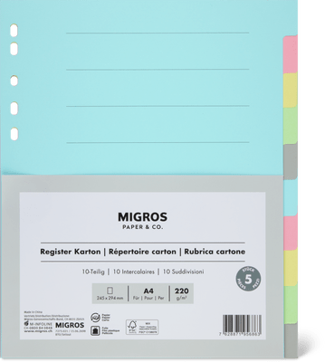 Migros Paper & Co. Separatori in cartoncino per rubrica A4, 10 separatori, colorati